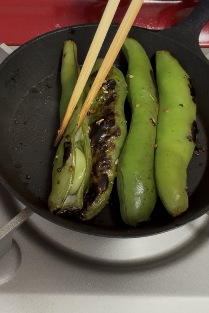 3. さやが黒く焦げてきたら裏返し、ふたをして蒸し焼きして3〜4分