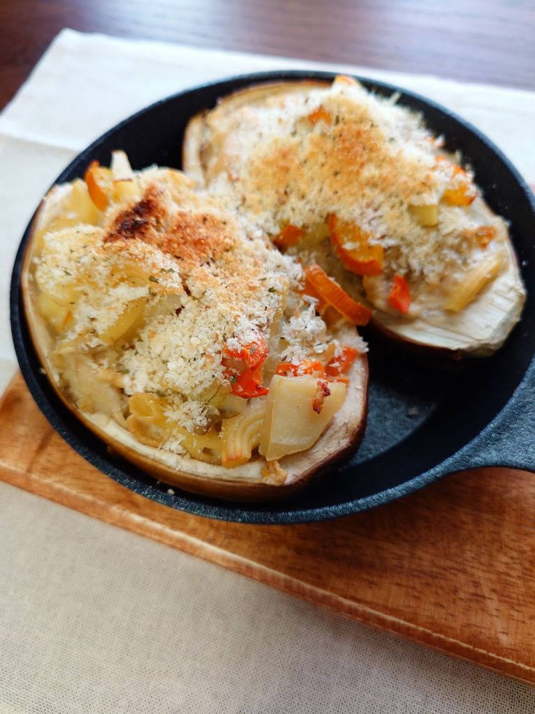 くり抜いた白ナスに、新じゃが・玉ねぎ・黄色ズッキーニ・鶏ささみ・豆乳・味噌を合わせて詰め、香ばしく焼き上げたひと品。