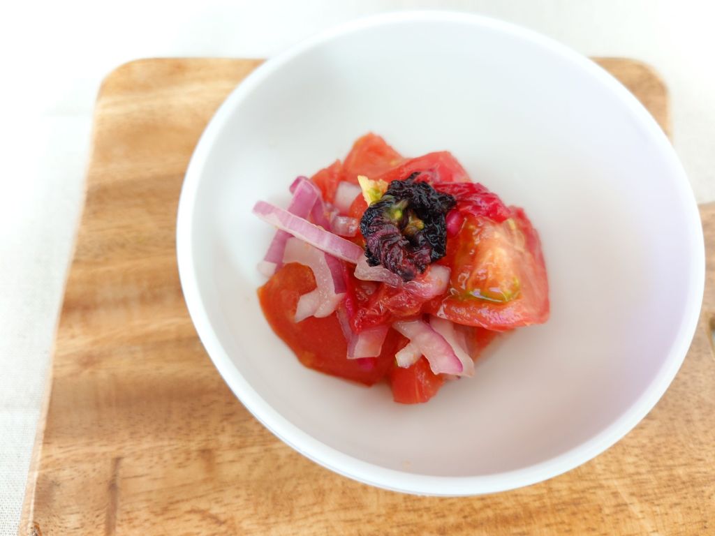 1. トマトをくし切りにし、紫玉ねぎは薄くスライスして水にさらす